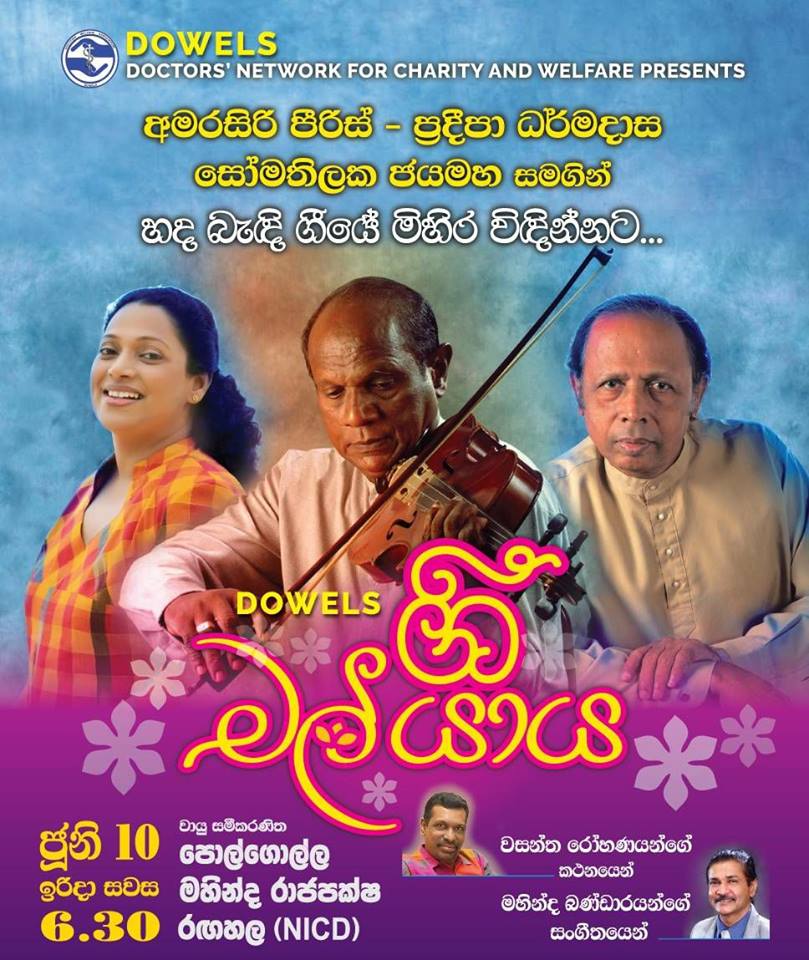 6:30 pm - 10:00 pm DOWELS Musical Show 10 Jun, 2018 @ 6:30 pm - 10:00 pm DOWELS Musical Show One of the most awaiting events in DOWELS calendar has planned now with Deepika Priyadharshani , Amarasiri Peiris & Somathilaka Jayamaha Free